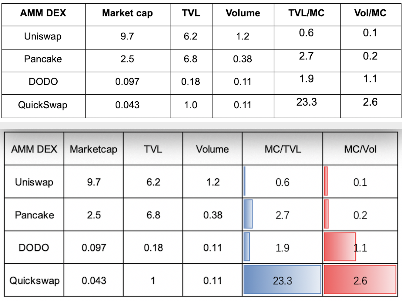 Both TVL and trading volume are important indicators to evaluate the size and purchasing power of AMM DEX users. If the market cap goes down, and TVL and trading volume go up, it means the potential of a project is great with strong prospects of future growth. That is to say, the larger the value of TVL/MC (TVL to market cap ratio) and Vol/MC (volume to market cap ratio), as shown in the table, the more promising a project is. What we can also see is that QuickSwap’s TVL/MC and Vol/MC are much higher than those of others, meaning the future potential is predictably strong.