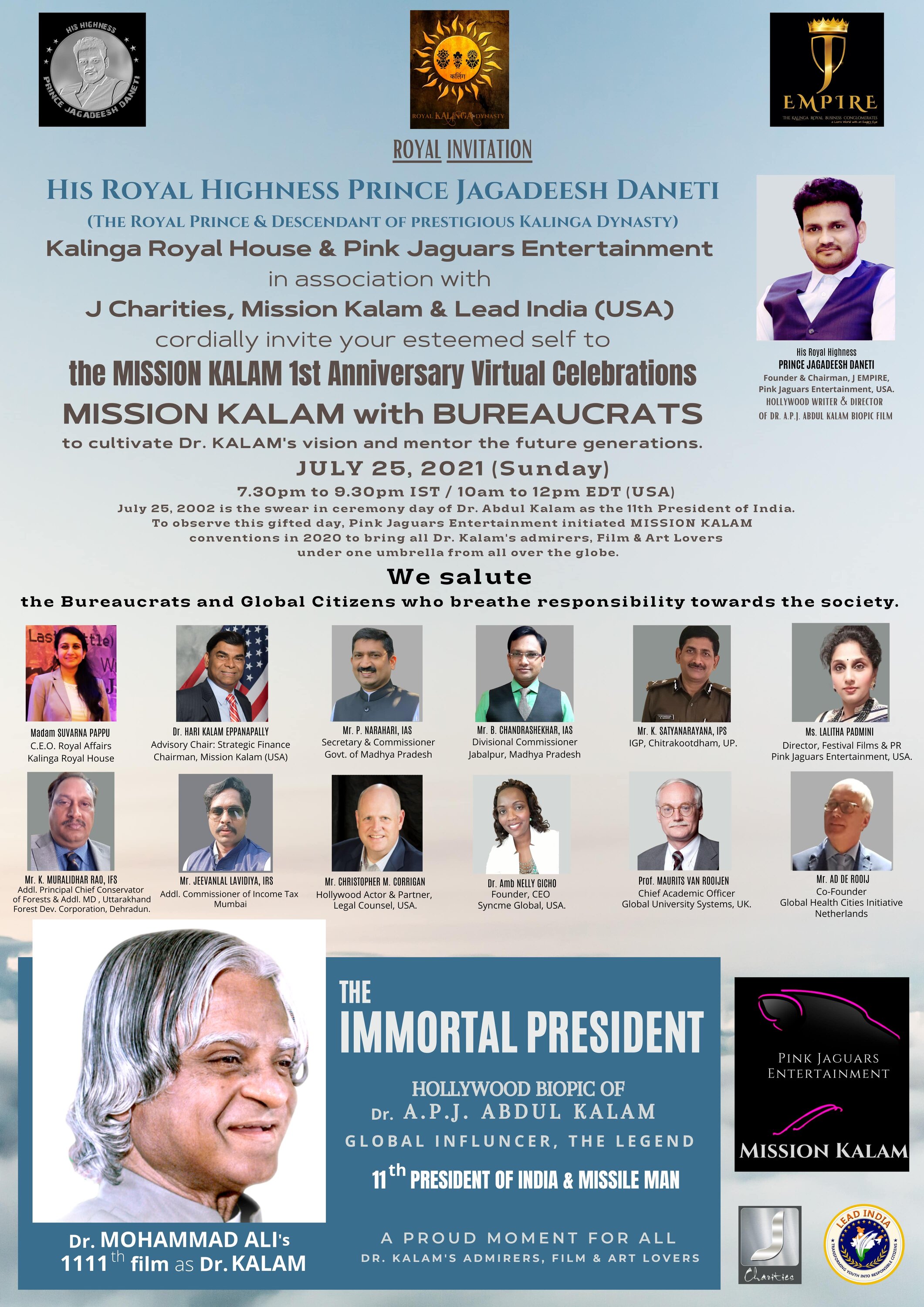 LOS ANGELES, CALIFORNIA, USA, July 26, 2021 /EINPresswire.com/ -- Indian Bureaucrats and World Influencers congratulated HRH Prince Jagadeesh Daneti and team of Pink Jaguars Entertainment on the first anniversary of the MISSION KALAM Global Convention.
