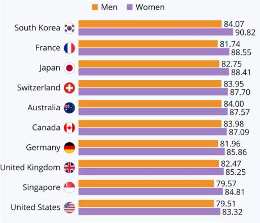 Meanwhile, the World Health Organization reports that the US has fallen significantly in projected life expectancy; by 2030, Americans can expect to live to 83.32 years (female) and 75.51 years (male), but that puts us behind Singapore, the UK, Germany, Canada, Australia, Switzerland, Japan, France, and the new leader, South Korea, which is projected to have a life expectancy of 90.82 years for women and 84.07 years for men by 2030.
