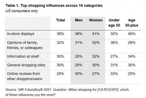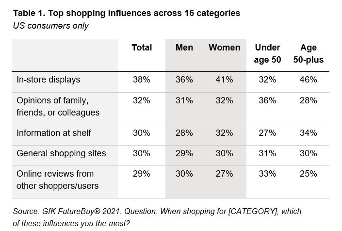 NEW YORK, NY, UNITED STATES, July 29, 2021 /EINPresswire.com/ -- After more than a year when online shopping was the lifeline of many US consumers, new GfK research affirms the continuing influence exerted by traditional in-store marketing tactics.The latest findings from GfK’s FutureBuy® study – the definitive source for brick-and-mortar, online, and omnichannel shopping trends – show that in-store displays hold the strongest influence across 16 product categories measured. (See Table 1.)