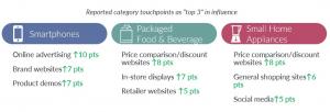 Sources of influence differ greatly by category, with in-store marketing proving strongest for FMCG products such as packaged food and beverages, household cleaners, and haircare products. When shopping for a smartphone, however, brand websites are by far the most influential, followed closely by the opinions of family, friends and colleagues. The biggest gainers among sources of influence were online touchpoints – from digital advertising to retailer websites to social media. (See Table 2.)
