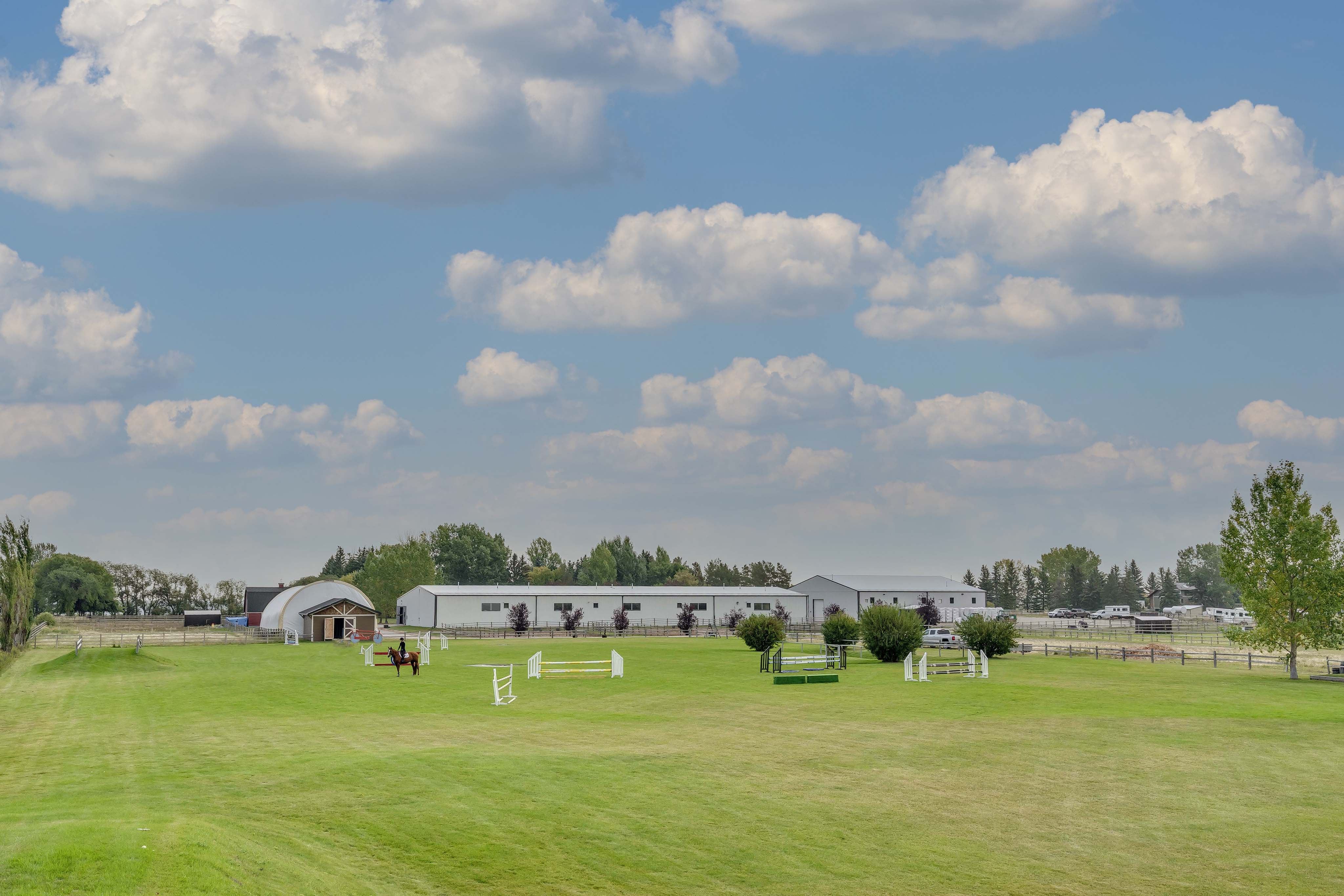 A state-of-the-art equine facility that presents a turn-key opportunity for seamless acquisition of the 19-acre parcel and the incredible facilities within. Start your day in the office of the main stable before heading out to the international level grass grand prix field that is any horseman’s dream, filled with natural jumps. Two spacious outdoor all-weather rings provide the perfect complement, with the addition of numerous turnout fields, grass and all-weather paddocks to choose from. The thoughtfully planned structures include three beautiful barns with every amenity and an oversized indoor arena that exhibits elegance and boasts many environmentally innovative features from the white French footing by renowned footing specialists NARS to wide windows that bathe the space in natural light. Sheltered in a grove of mature trees is the 2,052-square-foot main home, ideal for overnight guests, staff, or everyday living. Additional features include: a comfortable entrance lounge in the barn; 11 horse stalls; two grooming stalls; a wash bay; a full bathroom with shower; an upstairs office with a viewing lounge; a laundry room; a full kitchen; and a large tack room—all just 15 minutes from Calgary, or, for the adventurous: 90 minutes from Banff National Park.