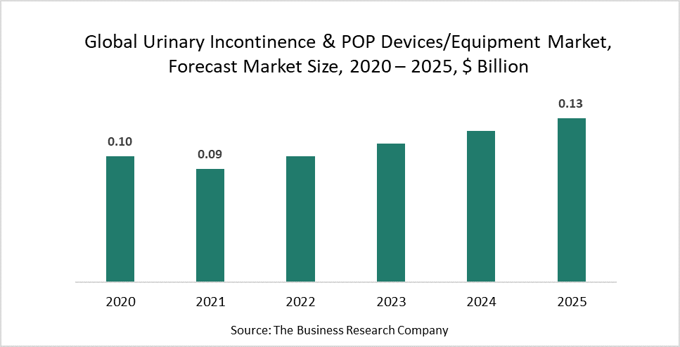The global urinary incontinence & pelvic organ prolapse devices and equipment market is expected to decline from $0.1 billion in 2020 to $0.09 billion in 2021 at a compound annual growth rate (CAGR) of -10%. The decline is mainly due to deferment of treatments due to the outbreak of COVID-19 that has led to fall in demand for the equipment. The urinary incontinence and pelvic organ prolapse market size is expected to reach $0.13 billion in 2025 at a CAGR of 9.6%.