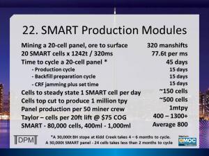 The SMART trolley ramp system was designed with 20 interchanges. SMART would top cut the 5 highest grade levels using up to 4 secondary production ramps to optimize SMART panel productivity. Mining 1 SMART cell per day requires cycling 5 SMART panels (~150 cells) to attain 100% utilization of mine equipment and labor. At $75 NSR COG, Taylor hosts 16,000 top cut cells and 64,000 standard SMART cells. Car parkade type internal ramps allows several 6m lifts to be mined in parallel. Mining 8 SMART cells or 10,000tpd requires top cutting about 1,200 SMART cells. Doubling Taylor mine-mill production rate to 16 SMART cells per day requires hiring 3 additional SMART mining crews plus 10, 65t trucks. See Image 22 for a table summarizing SMART Production Planning Modules.