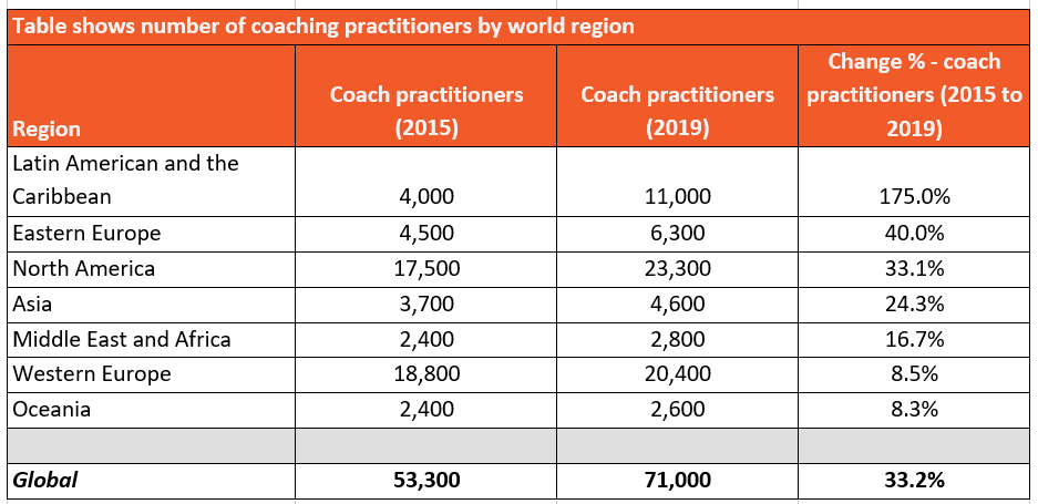 Latin America’s extraordinary growth in demand means that the number of coaching practitioners has increased by 175%, from 4,000 to 11,000. The number of practitioners is Eastern Europe has grown by 40%, and in North America the number has grown by 33% to create a total of 23,300 American coaching practitioners.