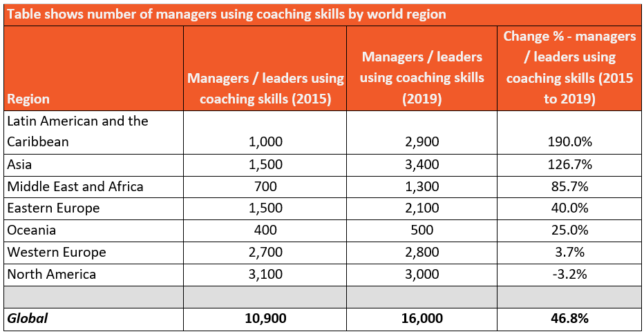 Latin America’s extraordinary growth is a result of the number of businesses and leaders choosing to provide coaching for their staff increasing by 190%, more than anywhere else in the world. The region now has 2,900 managers providing coaching for their staff, closing quickly on North America where a -3% decline in the number of managers providing coaching leaves the total at 3,000.