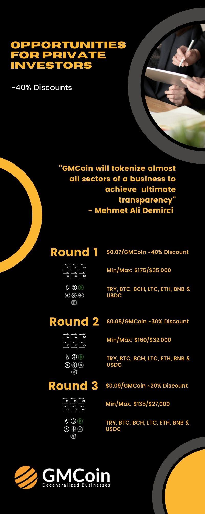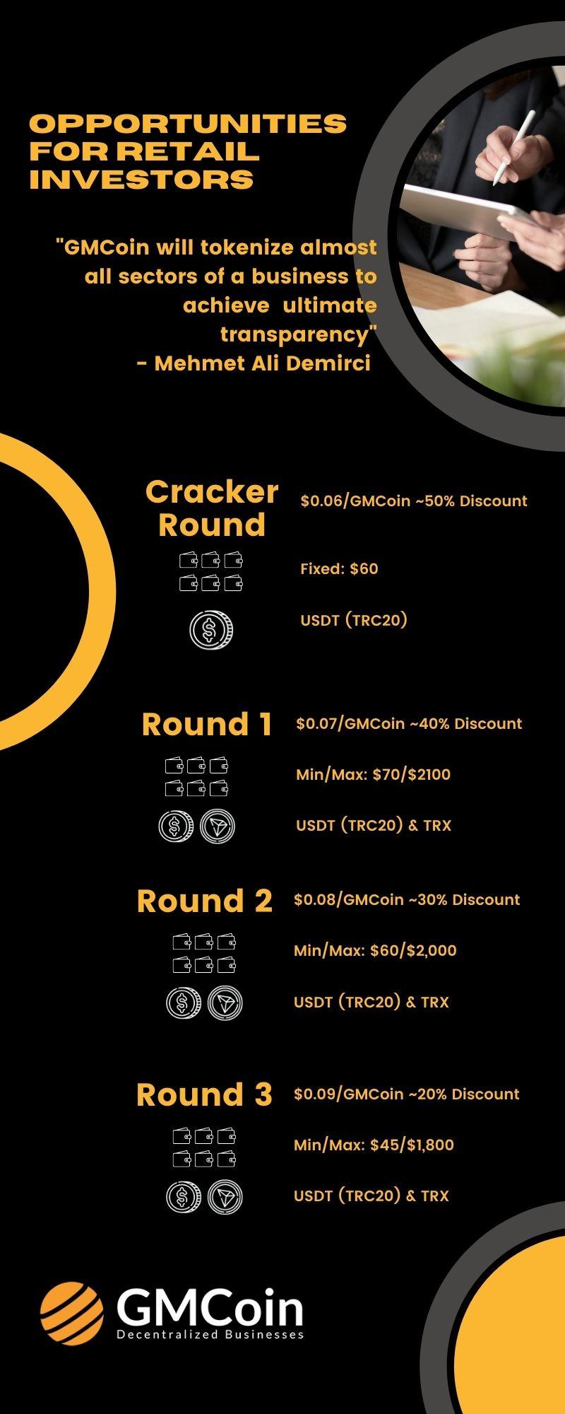 Each of them have minimum and maximum buying limitations along with KYC (required in some cases). Participation restricted for the countries; Afghanistan, Congo, Cuba, Iran, Iraq, Libya, North Korea, Syria and Tajikistan. Through the Central African Republic, Eritrea, Guinea, Lebanon, Mali, Namibia,Somalia, Sudan, Venezuela, Yemen and the United States residents must check their local laws and regulations prior to buying. More details can be found in the investors presentation of GMCoin.