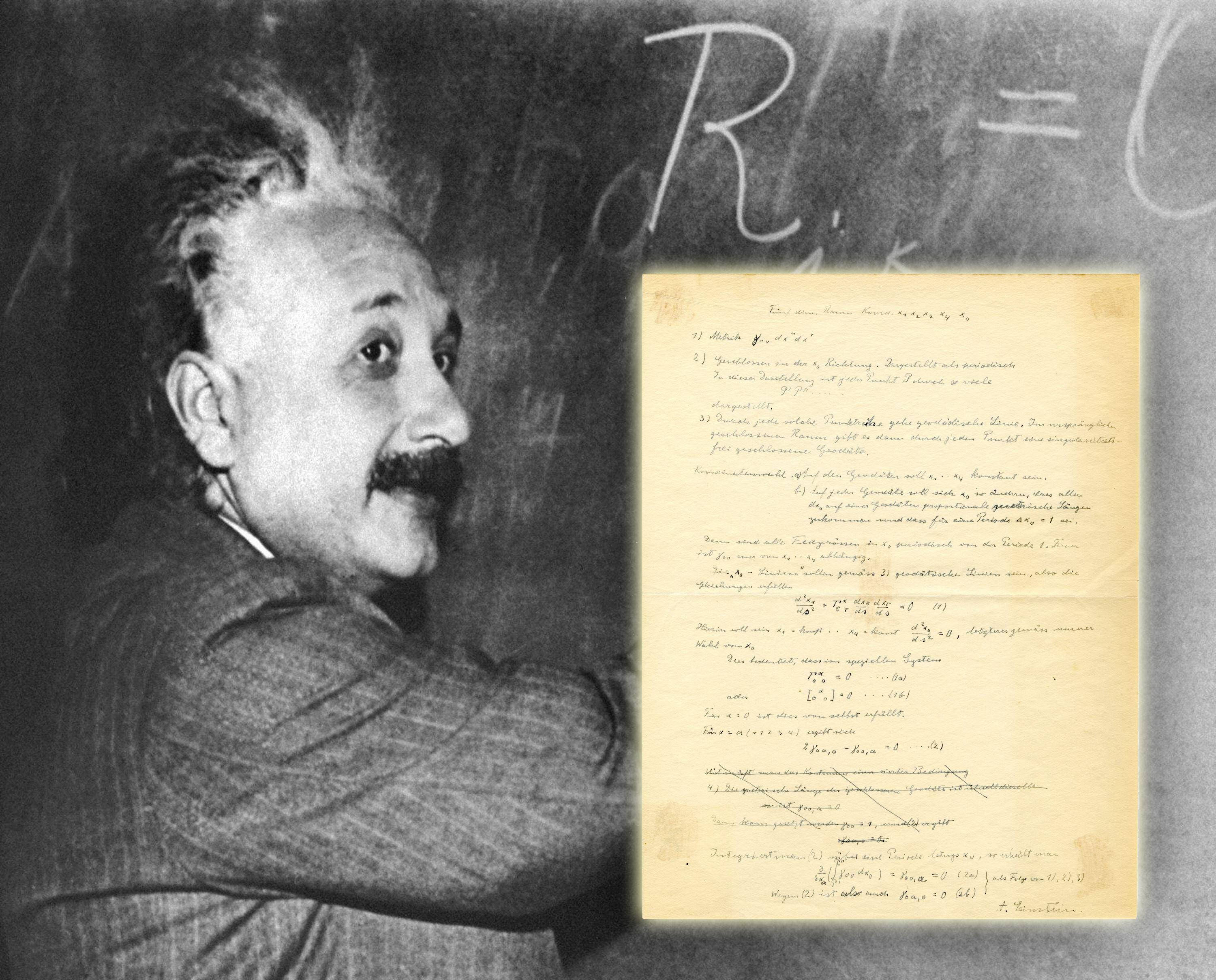 Working scientific manuscript inscribed in German and signed by Albert Einstein around 1938, in advance of a work later co-authored by him and Peter Bergman (est. $40,000-$50,000).