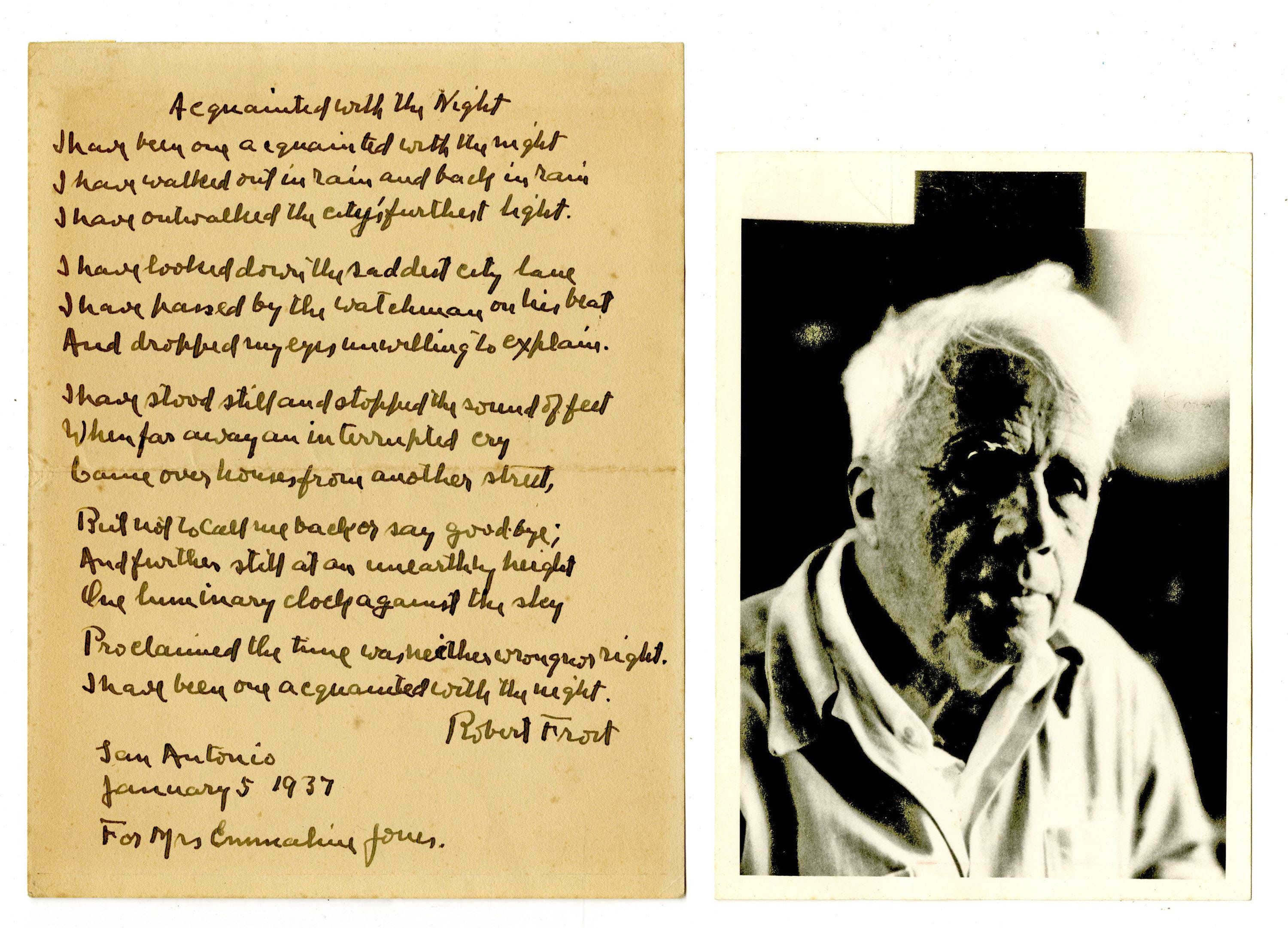 A small photocard dated 1864, depicting a seated portrait of the slave, abolitionist and women’s rights advocate Sojourner Truth, signed by her with an “x” as her mark, should command $24,000-$28,000. Also, a handwritten copy of the lovely poem Acquainted with the Night by Robert Frost, signed by the renowned poet and dated Jan. 5, 1937, composed for Mrs. Emmaline Jones, with a printed photo of Frost, should go for $7,000-$8,000.