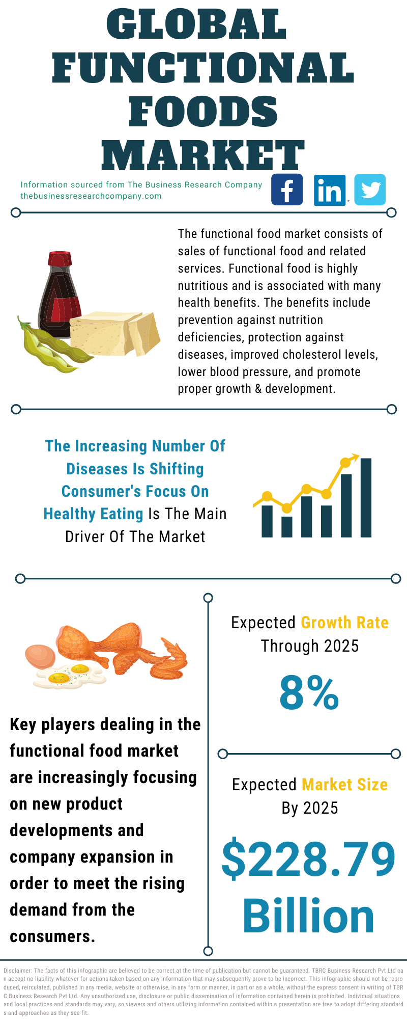 LONDON, GREATER LONDON , UK, August 12, 2021 /EINPresswire.com/ -- According to the new market research report ‘Functional Foods Global Market Report 2021: COVID-19 Growth And Change To 2030’ published by The Business Research Company, the functional foods market is expected grow from $161.99 billion in 2020 to $171.25 billion in 2021 at a compound annual growth rate (CAGR) of 5.7%. The growth is mainly due to the companies resuming their operations and adapting to the new normal while recovering from the COVID-19 impact, which had earlier led to restrictive containment measures involving social distancing, remote working, and the closure of commercial activities that resulted in operational challenges. The market is expected to reach $228.79 billion in 2025 at a CAGR of 8%. Increasing number of cardiovascular and other diseases across the globe is anticipated to generate higher demand for a healthy diet, which in turn, is likely to propel the revenues for the functional food market over the forecast period.