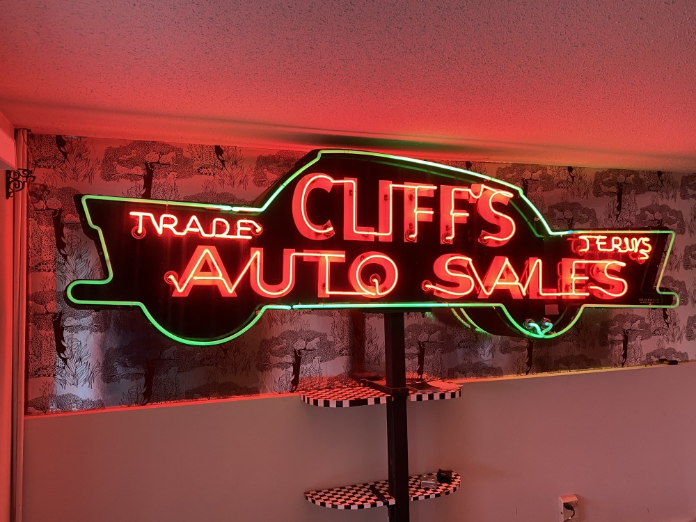 Vintage neon signs will include a neon Hollywood sign 16 feet long and 2 feet tall, a motel neon sign and this gorgeous neon sign for Cliff’s Auto Sales.