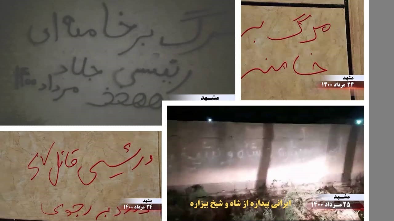 (PMOI / MEK Iran) and (NCRI): Mashhad – Activities of the MEK Resistance Units –"Death to Raisi, henchman of the 1988 massacre, death to Khamenei, hail to Rajavi" – August 16, 2021.