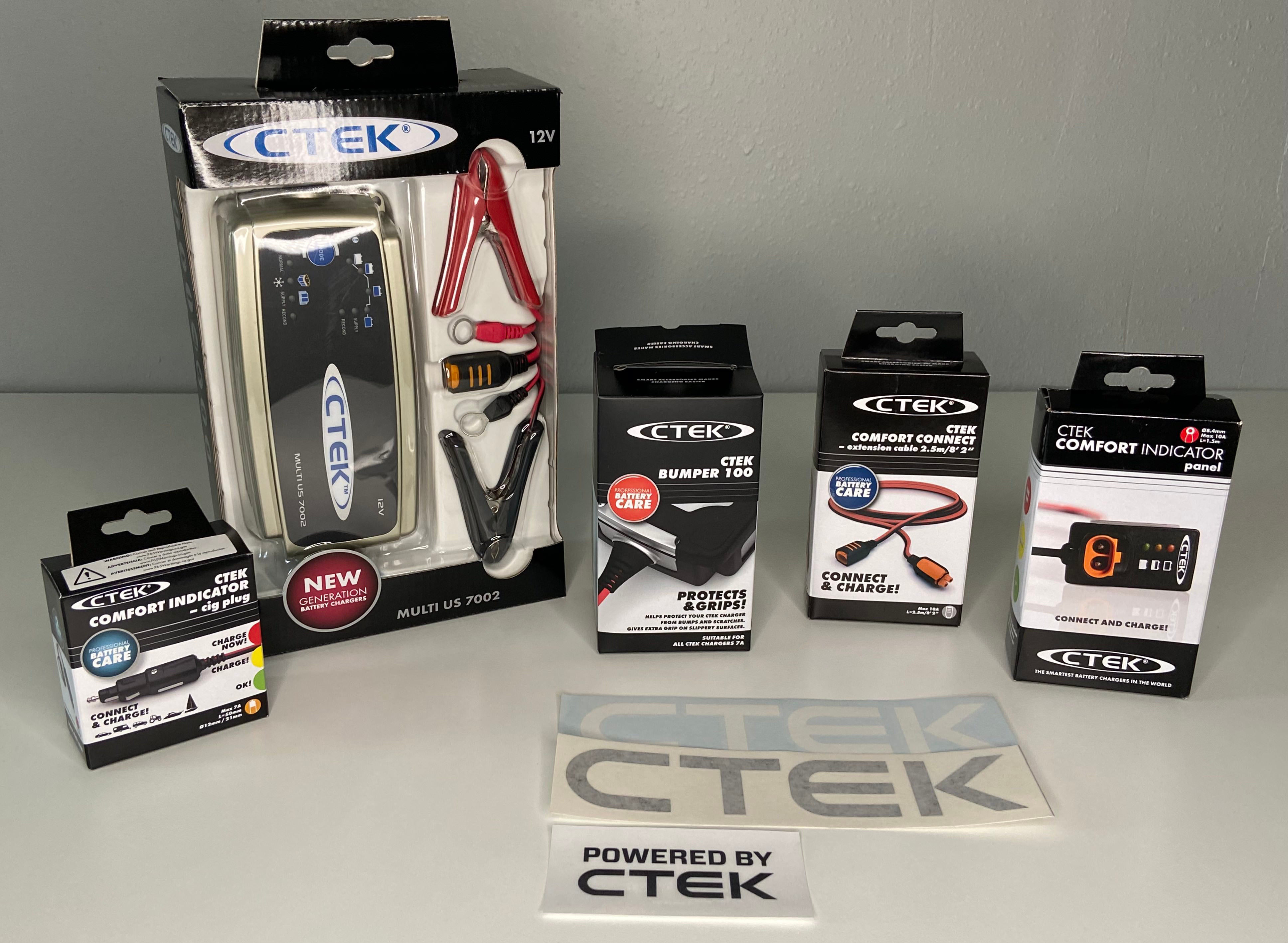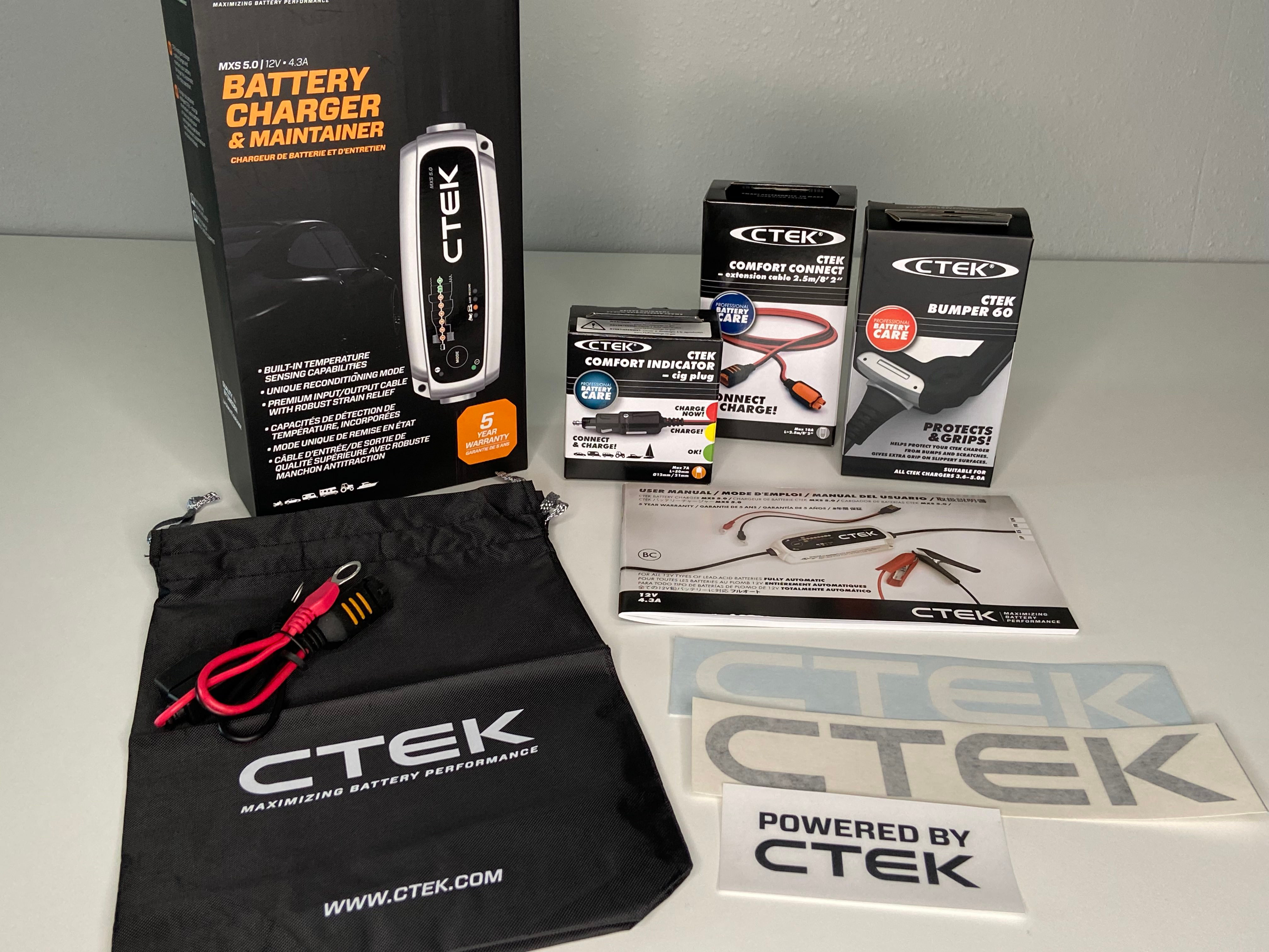 CTEK's Battery Care Kit 1 includes CTEK's popular MXS 5.0 charger, a protective bumper, the COMFORT CONNECT extension cable, and a COMFORT INDICATOR cig plug as well a CTEK static window cling and vinyl decals.