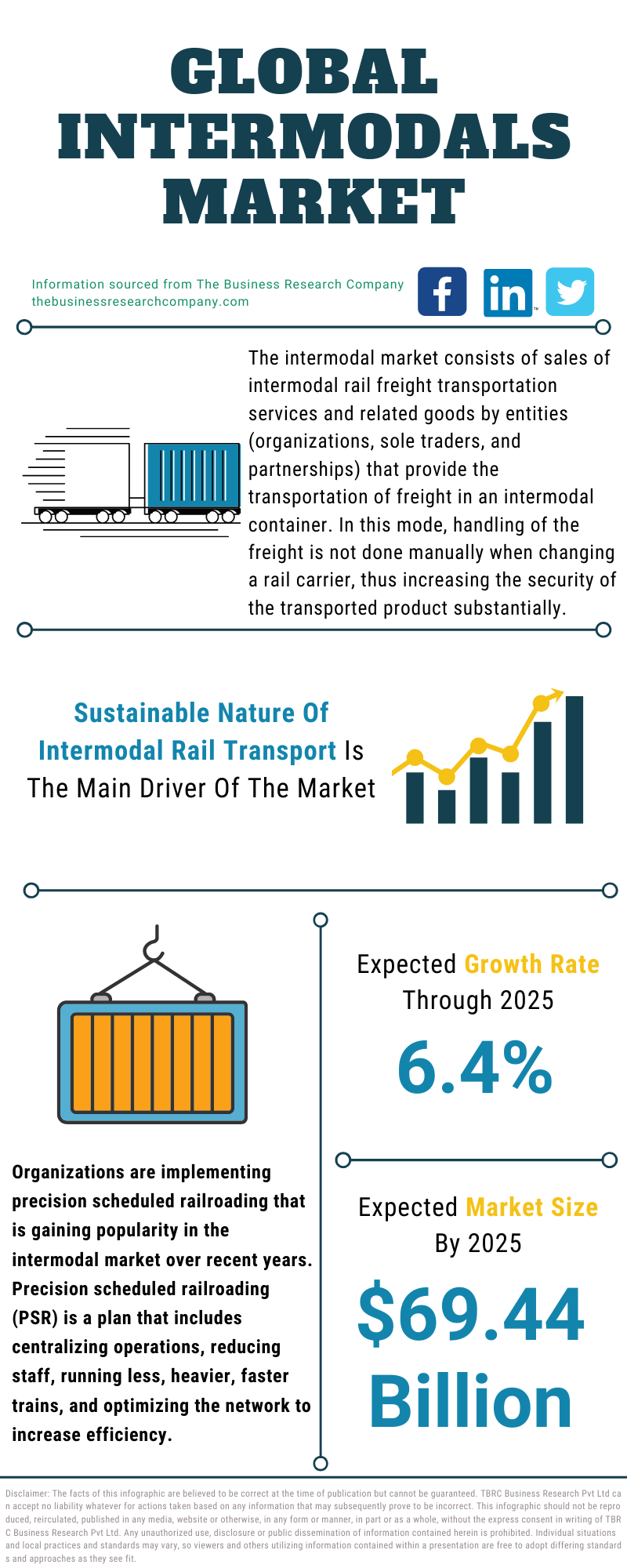 LONDON, GREATER LONDON , UK, August 19, 2021 /EINPresswire.com/ -- According to the new market research report ‘Intermodals Global Market Report 2021: COVID-19 Impact And Recovery To 2030’ published by The Business Research Company, the intermodals market is expected to grow from $49.48 billion in 2020 to $54.26 billion in 2021 at a compound annual growth rate (CAGR) of 9.7%. The growth is mainly due to the companies rearranging their operations and recovering from the COVID-19 impact, which had earlier led to restrictive containment measures involving social distancing, remote working, and the closure of commercial activities that resulted in operational challenges. The market is expected to reach $69.44 billion in 2025 at a CAGR of 6.4%. The sustainable nature of intermodal rail transport is expected to drive the intermodals market.