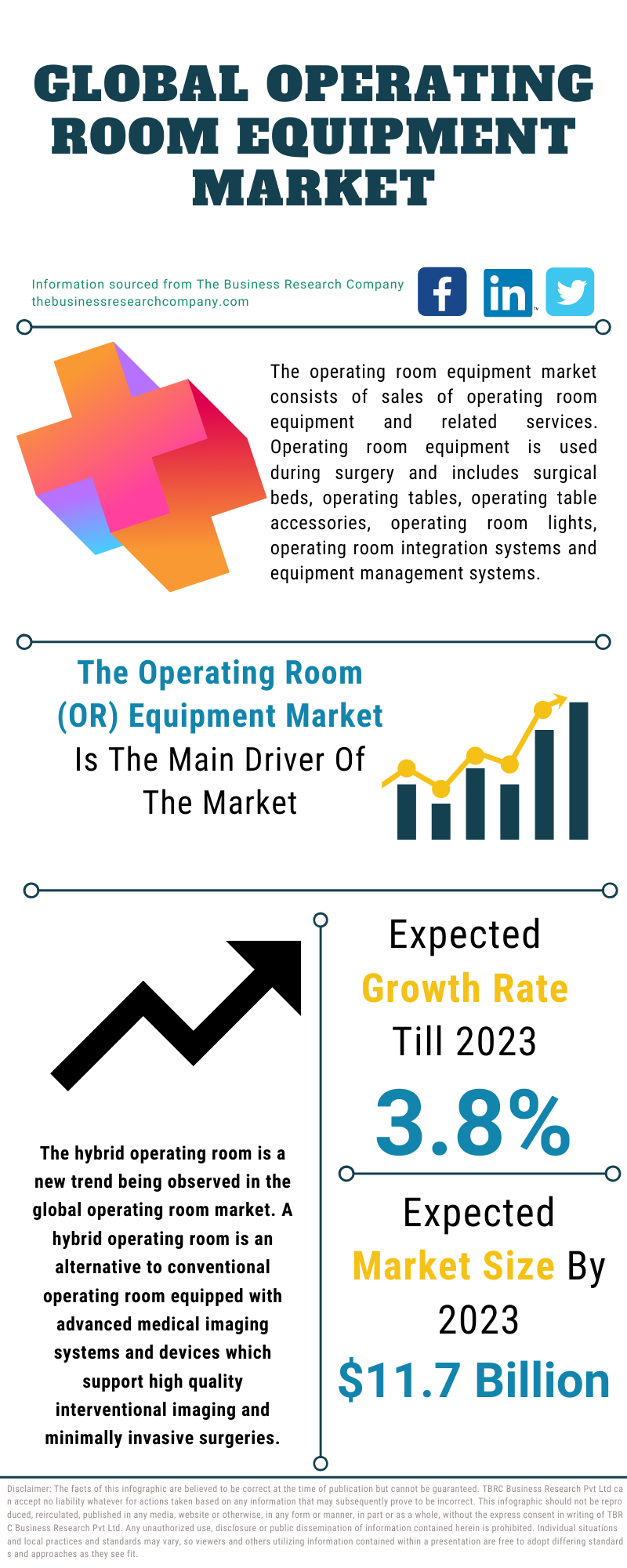 LONDON, GREATER LONDON, UK, August 19, 2021 /EINPresswire.com/ -- According to the new market research report ‘Operating Room Equipment Global Market Report 2020-30: Covid 19 Implications And Growth’ published by The Business Research Company, the operating room equipment market is expected to grow from $7.9 billion in 2019 to $10.8 billion in 2020 at a compound annual growth rate (CAGR) of 35.8%. The growth is mainly due to the COVID-19 outbreak and the surge in demand for hospitals supplies including personal protective equipment, surgical supplies, sterilization equipment, disinfectants and hospital beds, among others. With the increasing number of cases, hospitals are flooded with COVID-19 positive patients. In order to meet demand and address the supply shortage concerns, most of the hospitals have also suspended the non-urgent medical procedures. The market is then expected to grow at a CAGR of 3.8% from 2021 and reach $11.7 billion in 2023. The operating room (OR) equipment market is driven globally by the increase in ambulatory surgical centers (ASCs) across the world.