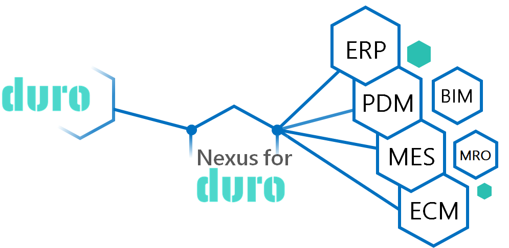 Nexus’ pre-configured connectors and transaction templates are purpose-built for Duro. This approach accelerates and lowers the cost of integrations and provides templates for common trigger action events such as releasing a BOM to ERP, publishing drawings or images to a content management system, or retrieving inventory or supplier data back into Duro.