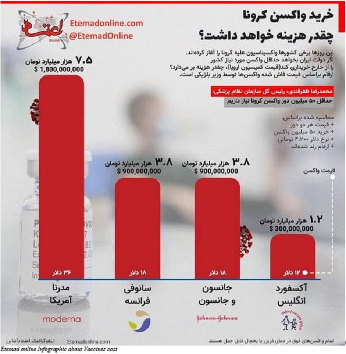 Etemad Online then examines four samples of vaccines that can be stored in the freezer to show the cost of vaccinating Iranian people.