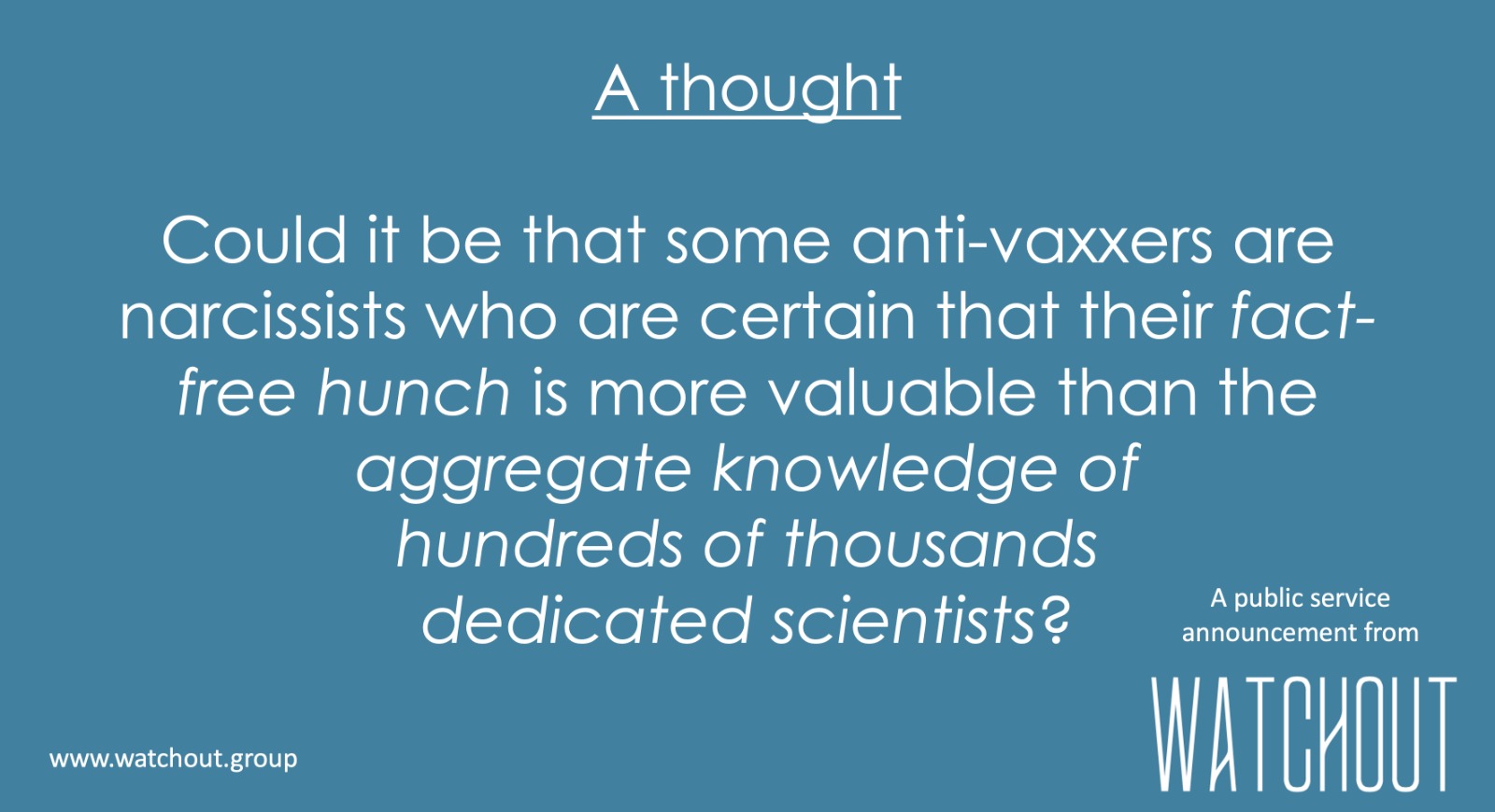 Klepfisz continued: “We are not providing our opinion of the facts. We are simply disseminating those scientific facts in a confronting and maybe sometimes entertaining manner together with some suggested courses of action, radical or otherwise. The WATCHOUT campaign will continue with intensity for at least the next 30 days. WE hope it has a discernible impact.”