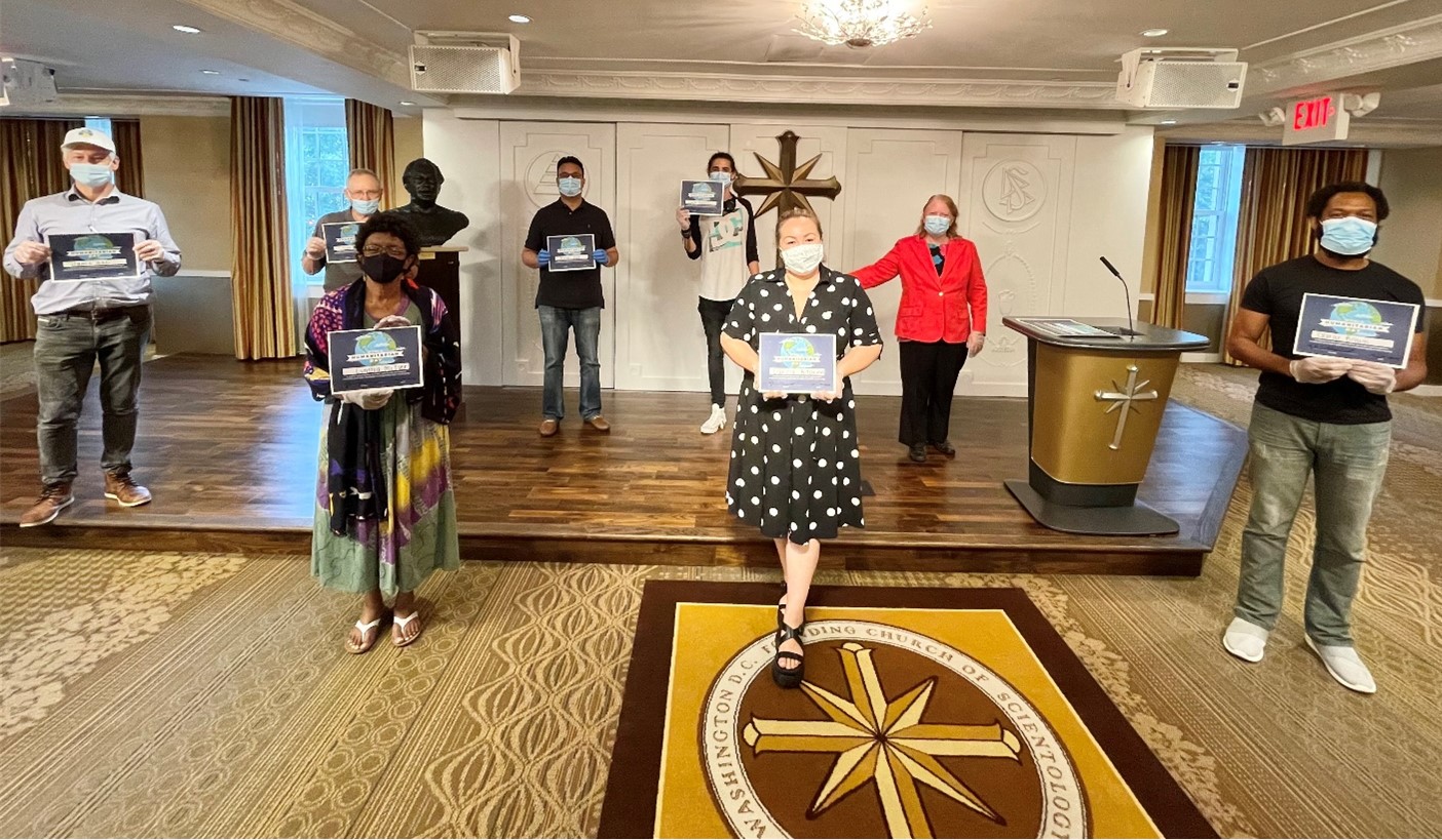 A socially-distanced event and ceremony was held at the Founding Church of Scientology in Washington, DC, to thank those who have volunteered their time to help. Volunteers helped on a variety of programs, such as getting information and assistance to families and neighborhoods struggling with a spike in overdose deaths. Volunteers have been doing events and booths almost daily throughout the city, bringing help and resources to the community about the dangers of drugs and how to help those on drugs. Other volunteers organized an online concert to teach about the UN Universal Declaration of Human Rights and produced virtual panel discussions and events to educate the community about human trafficking and how to protect their young people from this scourge.
