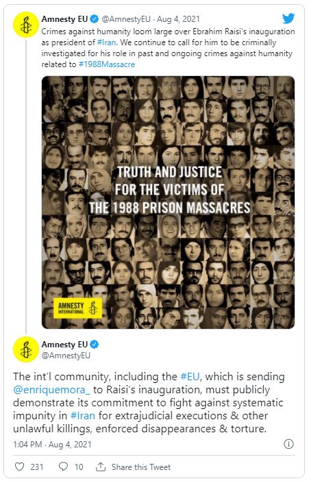 In June, the human rights organization Amnesty International published a statement condemning Raisi's successful election.