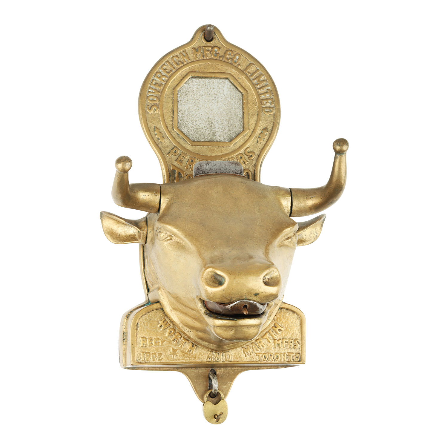 Worth and Martin (Toronto) one-cent bull’s head perfume dispenser (“Take the bull by the horns!”), made in 1902, solid brass, accept large Canadian cents (estimate: CA$6,000-$9,000).