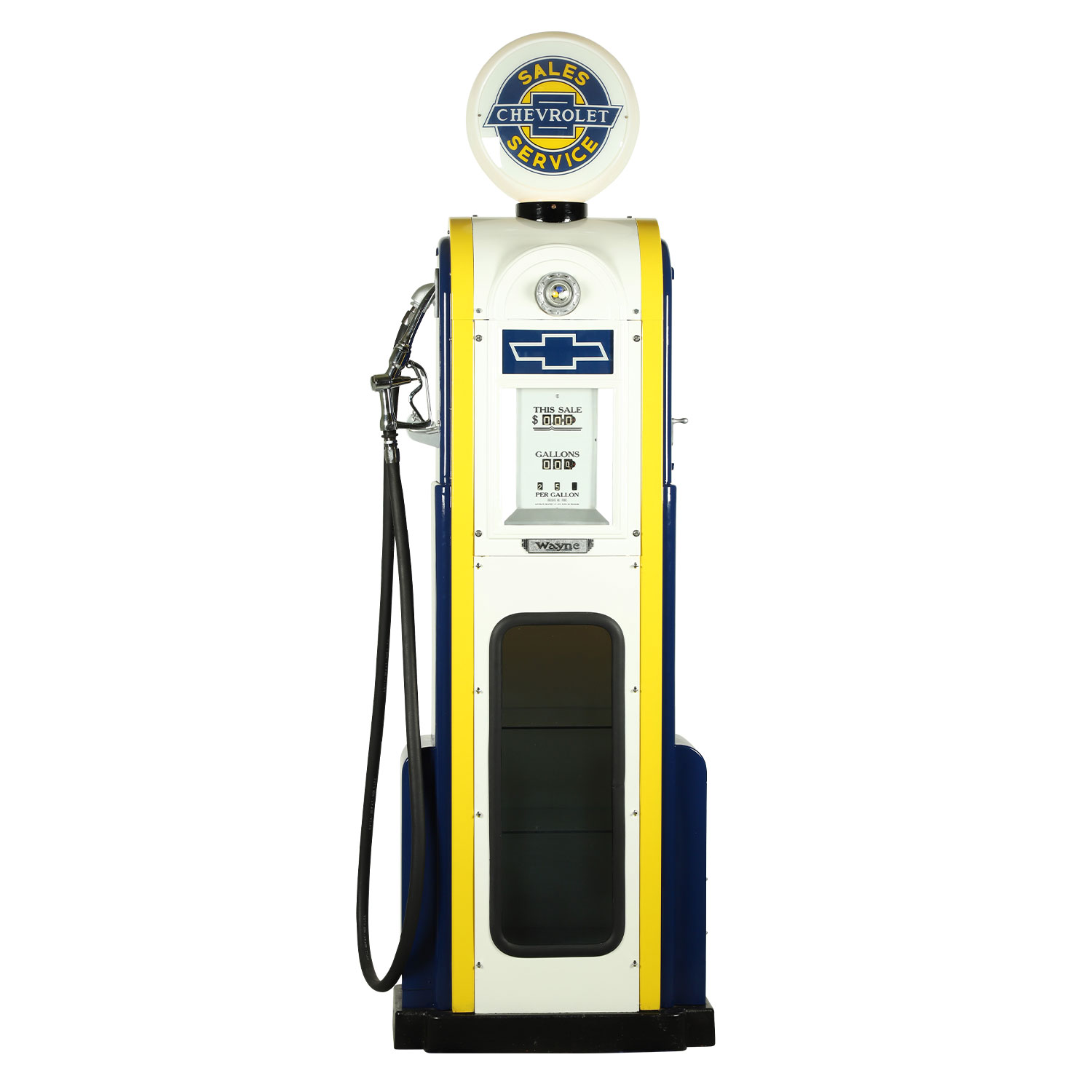 1940s Wayne Model 60 American made Chevrolet gas pump, 92 inches tall and professionally restored, including paint and reproduction globe lenses (estimate: CA$6,000-$9,000).