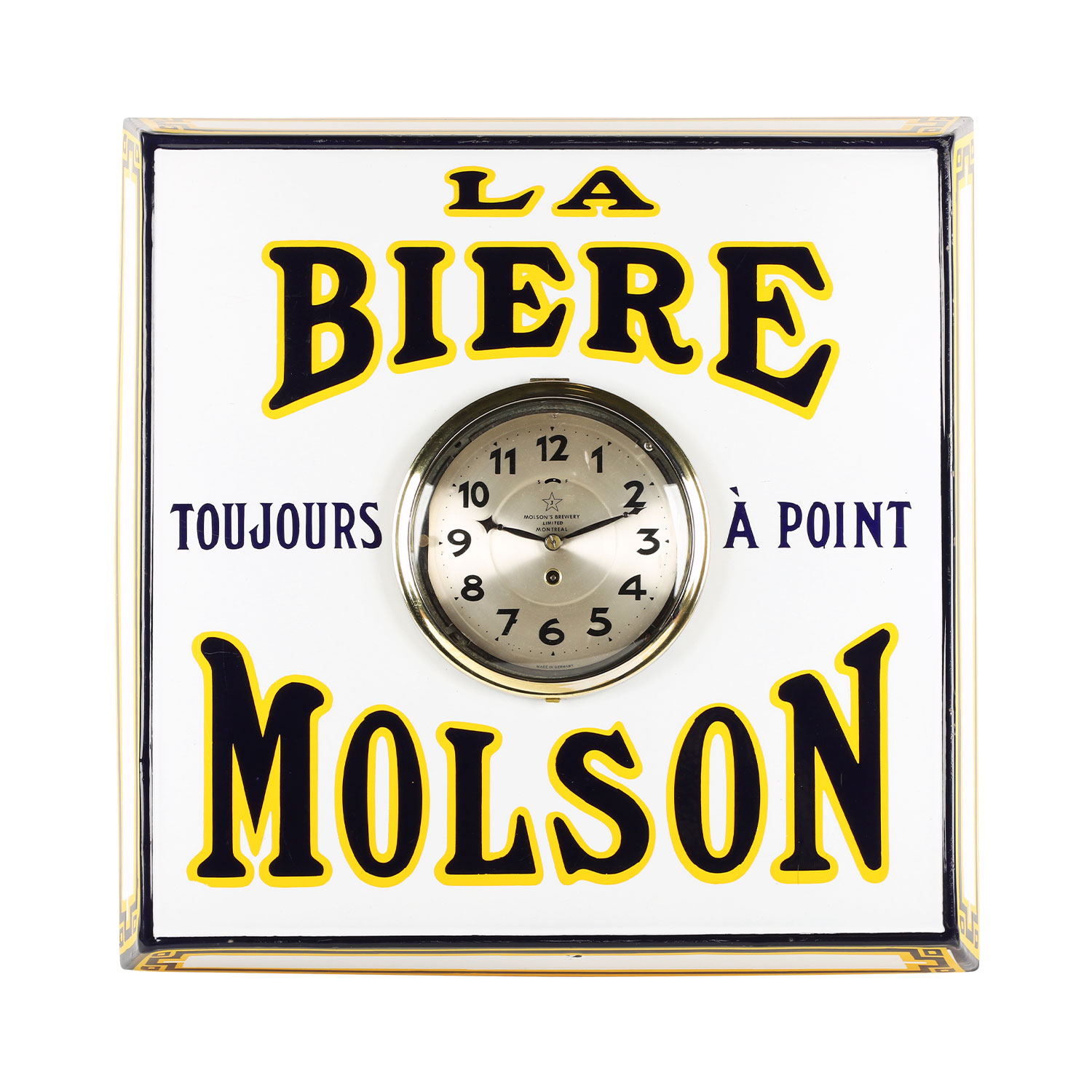 A Molson’s Beer clock, made for the French-Canadian market in the 1930s, porcelain with a screened metal clock dial marked “Made in Germany”, should bring $4,000-$6,000. Very few porcelain advertising signs were appointed with high quality mechanical clocks. Also, a Black Cat Shoe Polish lithographed tin clock, made in Canada in the early 20th century, marked “MacDonald Mfg. Co. Limited, Toronto”, non-functioning, has an estimate of $2,000-$3,000.