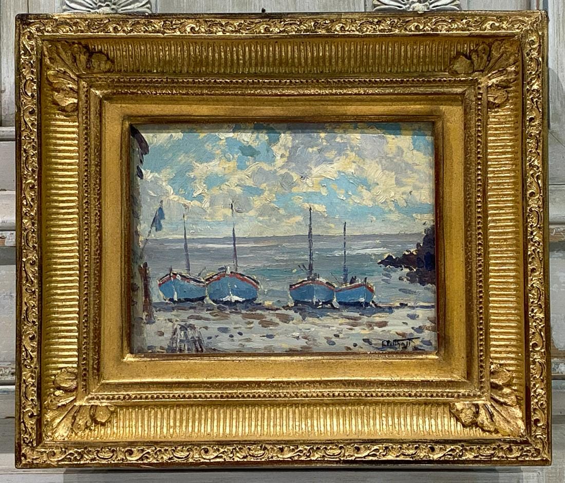 Oil on panel marine painting by Edward Potthast (1857-1927), titled Blue Boats (circa 1920s), signed lower right and nicely housed in a 14 ¼ inch by 12 ¼ inch frame.