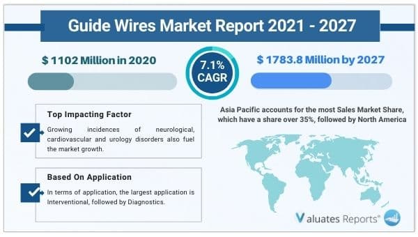 BANGALORE, KARNATAKA, INDIA, September 7, 2021 /EINPresswire.com/ -- Guidewires Market Statistics 2027In 2020, the global Guide Wires market size was USD 1102 Million and it is expected to reach USD 1783.8 Million by the end of 2027, with a CAGR of 7.1% during 2021-2027. Growing incidences of neurological, cardiovascular and urology disorders also fuel the market growth. It is important for patients to fully understand the risks of the procedure undergoing laparoscopy and other cardiovascular, neurovascular surgeries. Some risk factors associated with of minimally invasive surgery and preference given to open surgery may hamper the growth of this market.