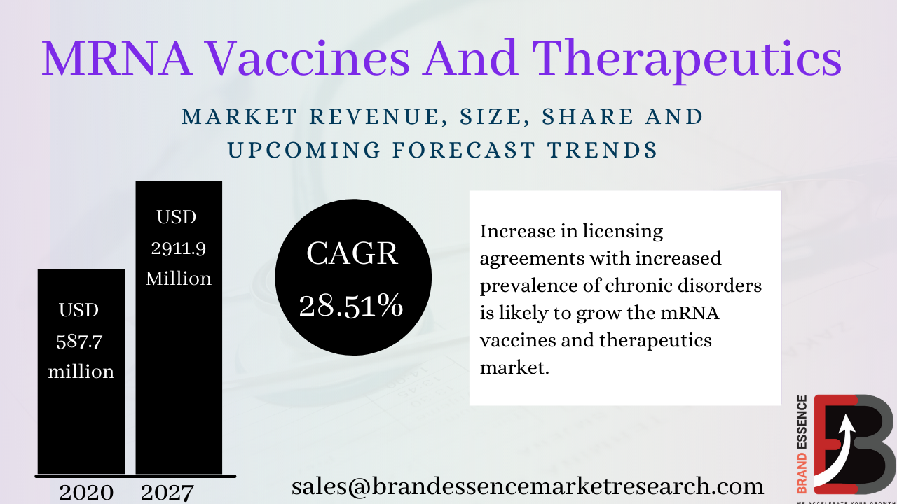 PUNE, MAHARSHTRA, INDIA, September 8, 2021 /EINPresswire.com/ -- According to latest report " mRNA Vaccines Market Size, Share & Trends Analysis Report By Type (Standardized Therapeutic Cancer mRNA Vaccines, Individualized Therapeutic Cancer mRNA Vaccines, Therapeutic Infectious Disease mRNA Vaccines, mRNA Therapeutic for Other Diseases), By Mechanism Of Action (Bioengineered Vaccine, Gene Therapy (Gene Silencing/Suppression), Gene Transcription (Protein Generation), Cell Therapy, Monoclonal Antibody, Others), By Application (Infectious Disease, Cancer, Other) Based On Region, And Segment Forecasts, 2021 - 2026", by Brand Essence Market Research mRNA Vaccines on the Market is valued at USD 587.7 million in 2018 and expected to reach USD 2911.9 Million By 2026 with the CAGR of 28.51% over the forecast period.