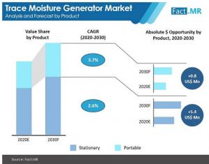 ROCKVILLE, MARYLAND, UNITED STATES, September 13, 2021 /EINPresswire.com/ -- The global trace moisture generator market was valued at US$ 19.9 million in 2020 and is anticipated to add value worth US$ 6.2 million during the forecast period. The impact of COVID-19 will leave a residual impact, with growth projected at an abysmal 2.7% through 2030. This is largely attributed to latency in end use industries amid stringent lockdowns in many countries. Trade suspensions to prevent the spread of COVID-19 have drastically impacted the market, resulting in a sharp dip in overall revenue. The global sales of trace moisture generator are projected to create an absolute $ opportunity of more than US$ 6 million, to be valued at US$ 26 million by the end of forecast period (2020 – 2030).Plunging demand in microelectronics, petrochemical & chemical industries pose a serious threat of momentum loss in the trace moisture generator market. However, on the contrary, upsurge in the demand for medical gases amid COVID-19 pandemic is expected to create significant opportunities in the market, as it is mandatory to manufacture medical gases with minimum level of moisture as per international standards. On the back of this trend, the trace moisture generator market is poised to expand by 1.3X during the forecast period (2020 – 2030).