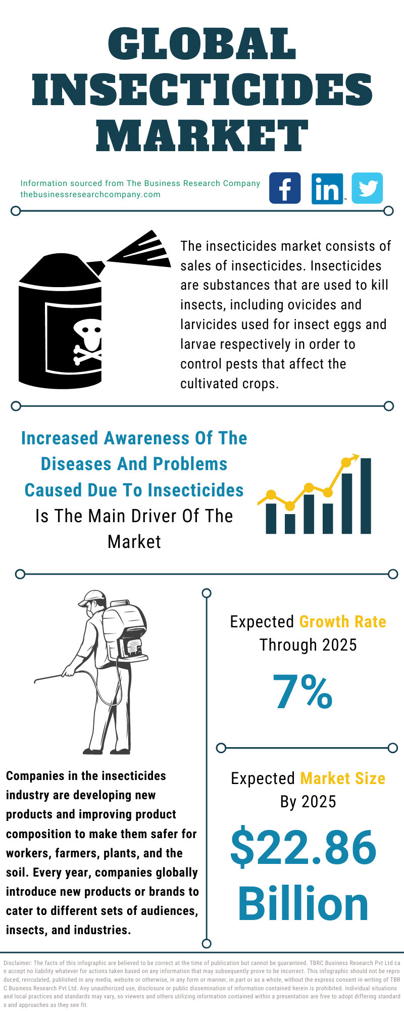 The global insecticides market size is expected to grow from $16.68 billion in 2020 to $17.63 billion in 2021 at a compound annual growth rate (CAGR) of 5.7%. The growth is mainly due to the companies rearranging their operations and recovering from the COVID-19 impact, which had earlier led to restrictive containment measures involving social distancing, remote working, and the closure of commercial activities that resulted in operational challenges. The market is expected to reach $22.86 billion in 2025 at a CAGR of 7%.