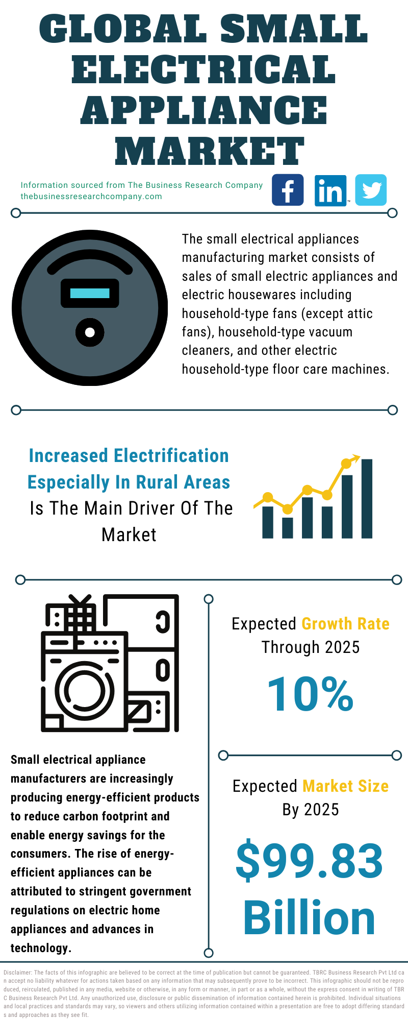LONDON, GREATER LONDON, UK, September 21, 2021 /EINPresswire.com/ -- According to the new market research report ‘Small Electrical Appliance Global Market Report 2021: COVID-19 Impact And Recovery’ published by The Business Research Company, the small electrical appliance market is expected to grow from $60.83 billion in 2020 to $67.49 billion in 2021 at a compound annual growth rate (CAGR) of 10.9%.The growth is mainly due to the companies rearranging their operations and recovering from the COVID-19 impact, which had earlier led to restrictive containment measures involving social distancing, remote working, and the closure of commercial activities that resulted in operational challenges. The market is expected to reach $99.83 billion in 2025 at a CAGR of 10%. Increased electrification especially in rural areas has contributed to the growth of the small electrical appliances market in the forecast period.