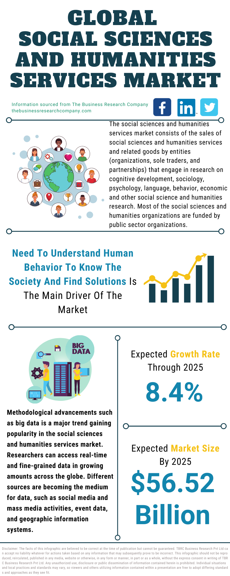 LONDON, GREATER LONDON, UK, September 21, 2021 /EINPresswire.com/ -- According to the new market research report ‘Social Sciences And Humanities Services Global Market Report 2021’ published by The Business Research Company, the social sciences and humanities services market is expected to grow from $39.06 billion in 2020 to $40.93 billion in 2021 at a compound annual growth rate (CAGR) of 4.8%. The growth is mainly due to the companies rearranging their operations and recovering from the COVID-19 impact, which had earlier led to restrictive containment measures involving social distancing, remote working, and the closure of commercial activities that resulted in operational challenges. The market is expected to reach $56.52 billion in 2025 at a CAGR of 8.4%. The need to understand human behavior to know the society and find solutions is therefore driving the market.