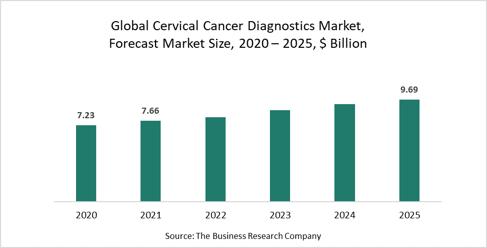 The global cervical cancer diagnostics market size is expected to grow from $7.23 billion in 2020 to $7.66 billion in 2021 at a compound annual growth rate (CAGR) of 6%. The growth is mainly due to the companies resuming their operations and adapting to the new normal while recovering from the COVID-19 impact, which had earlier led to restrictive containment measures involving social distancing, remote working, and the closure of commercial activities that resulted in operational challenges. The cervical cancer screening market is expected to reach $9.69 billion in 2025 at a CAGR of 6%.