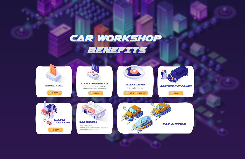 Moreover, the CryptoCars team has also introduced a workshop which is limited for Auction so owners can benefit with a huge revenue stream and create a totally new era for developing into CryptoCity.