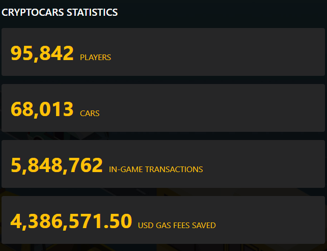 The first is about technology. As CryptoCars uses BigchainDB, a blockchain technology that allows Cryptocars players not to pay gas fees when playing. CryptoCars already has 96,000 players, with 68.000 cars in the game, and there have been 5.6 million in game transactions and $4.4 million gas fees saved for racers.