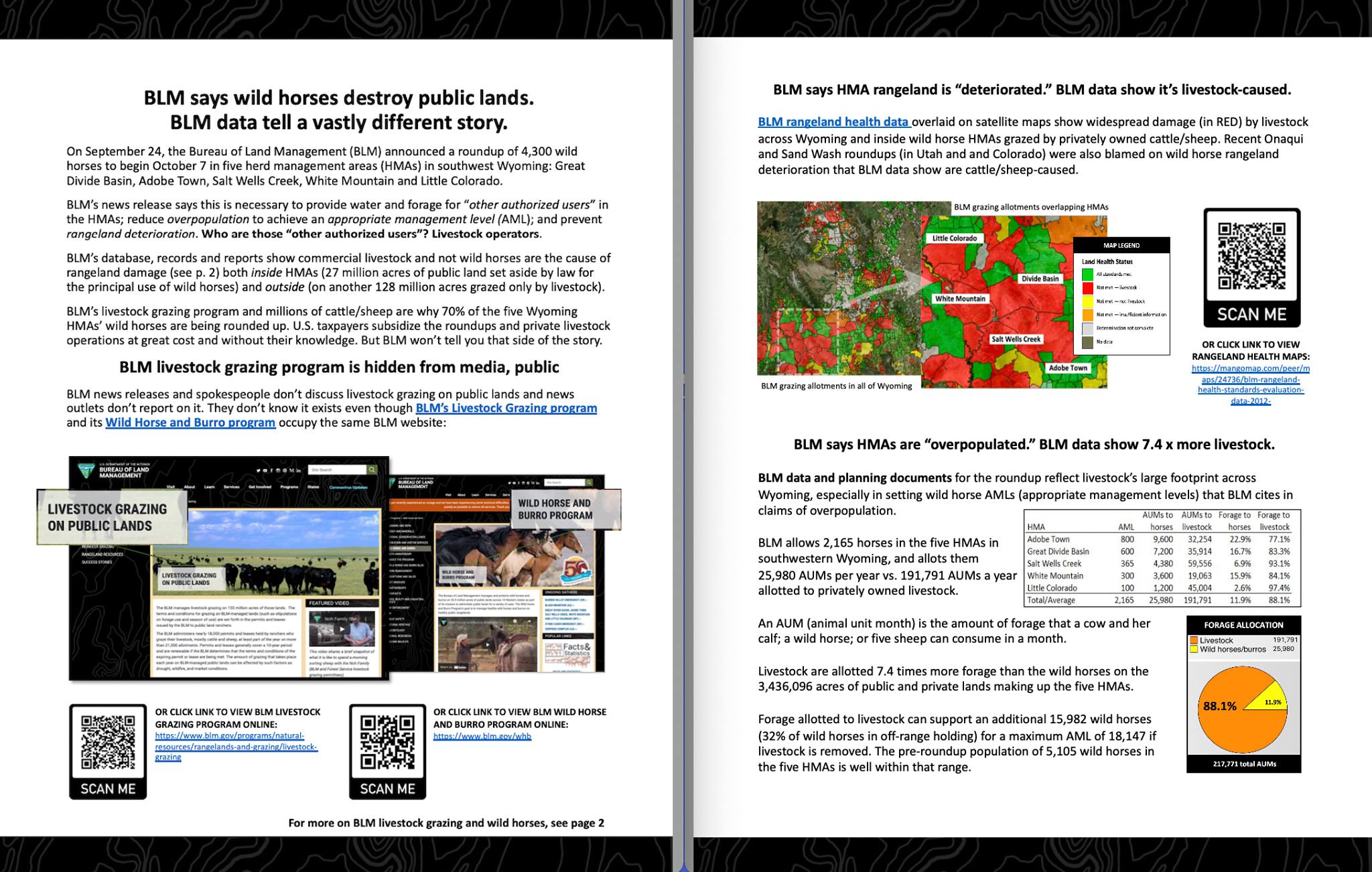 The Cowboy State Daily published an article on October 11th titled ‘Survey: Majority Of Americans Against Wyoming’s Wild Horse Roundup.’ The author reported “the poll found that 69% of respondents opposed removing all wild horses from 1.5 million acres of public lands in southern Wyoming to accommodate the oil/gas and livestock industries.”