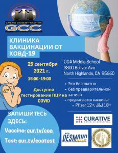 NORTH HIGHLANDS, CA, USA, September 27, 2021 /EINPresswire.com/ -- Still need a COVID-19 vaccine? The Slavic-American Chamber of Commerce is hosting a free Community COVID-19 Vaccination Clinic in partnership Gateway Community Charters, Sacramento County Supervisor Rich Desmond and Curative. Free COVID-19 testing will be also available. No appointment is required, walk-ins are welcomed! The clinic will be held at the Community Outreach Academy Middle School located at 3800 Bolivar Ave in North Highlands from 3:00pm – 7:00pm. This clinic brings COVID-19 vaccines and testing closer to home for those living in or near the North Highlands community.COVID-19 vaccines are free and will be available for anyone over 12 regardless of insurance or immigration status and anyone under the age of 18 wanting to get vaccinated will need a parent or guardian present or a permission slip. The event will be administering the Pfizer vaccine and the one-shot Johnson & Johnson vaccine. Participants can walk-in or schedule an appointment online using the following links. For vaccine appointments, visit cur.tv/coa. For testing appointments, visit cur.tv/coatest