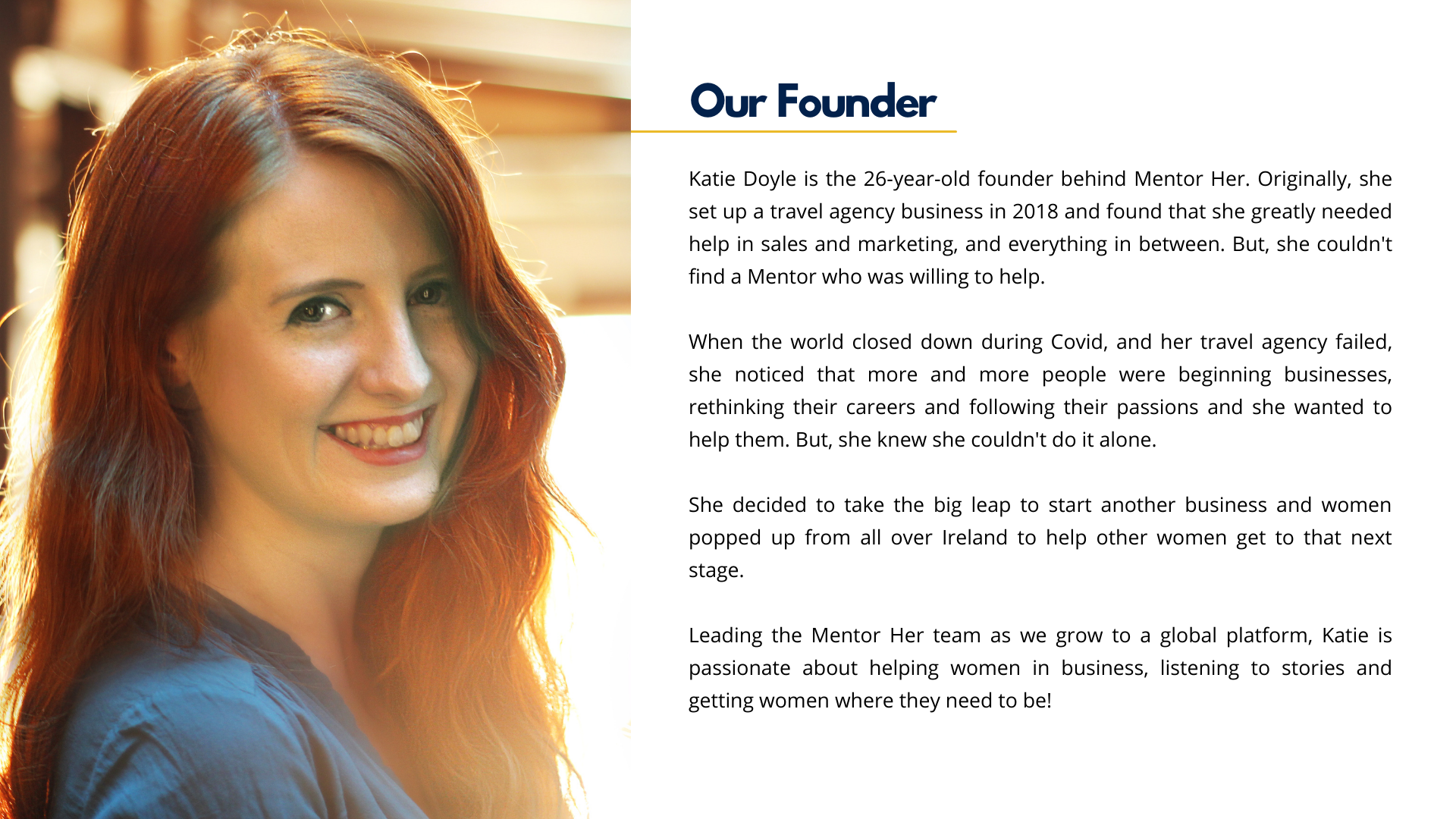 DUBLIN, IRELAND, September 28, 2021 /EINPresswire.com/ -- Irish tech start-up Mentor Her believes women need to support one another in the workplace instead of relying on men to do the work on their behalf. The experiences of women in the workplace needs targeted support, who better to do that than women who have pursued that path before them?