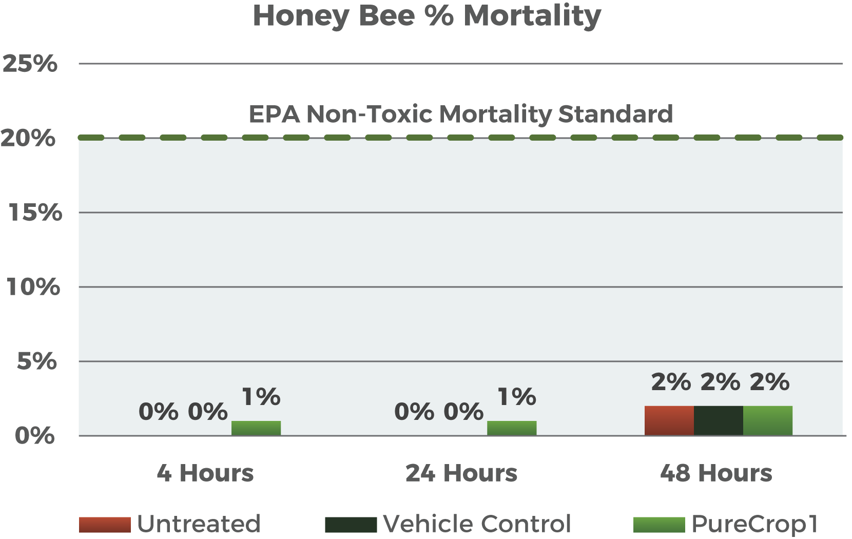 STILLMEADOW, Inc., a research facility specializing in environmental toxicology, animal health, and entomology, evaluated the effects of PureCrop1 on honey bees. The objective of this study was to assess the acute contact toxicity potential of the tested substance, PureCrop1, when administered topically to adult worker honey bees following the Environmental Protection Agency Office of Chemical Safety and Pollution Prevention Guidelines. The study director concluded, "PureCrop1 is considered to be greater than the nominal dose of 25 μg a.i./bee and was non-toxic when administered by contact to adult honey bees." In other words, PureCrop1 was tested at six times over the suggested dilution rate and prove non-toxic to bees.