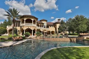 Expansive landscaped grounds surround this luxury home in scenic Magnolia. An arched double-door entry and grand two-story foyer greet upon entrance, with twin wrought-iron staircases leading up towards custom chandeliers. The extreme attention to detail carries throughout the 14,377-square-foot estate, from the gourmet kitchen with separate catering kitchen to the formal dining room with a hand-painted mural ceiling. Guests can enjoy a tasting in the climate-controlled wine room or take a dip in one of the three roomy pools, inclusive of a tiered main pool with swim-up bar tucked into a cave. Indoor recreation can be found in the two-story library and games room plus pub. Every inch of the 20+ acre resort-like grounds is ready to enjoy thanks to landscaped lighting and golf cart paths throughout. Take a swing at the par three golf hole or enjoy the 2.5-acre pond stocked with bass for private fishing.