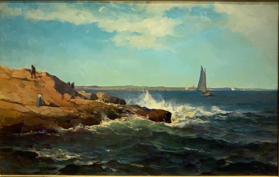Oil on canvas marine work by Mauritz Frederik De Haas (Dutch/American, 1832-1895), of a craggy coast with figures along the rocks and sails at sea, signed ($8,610).