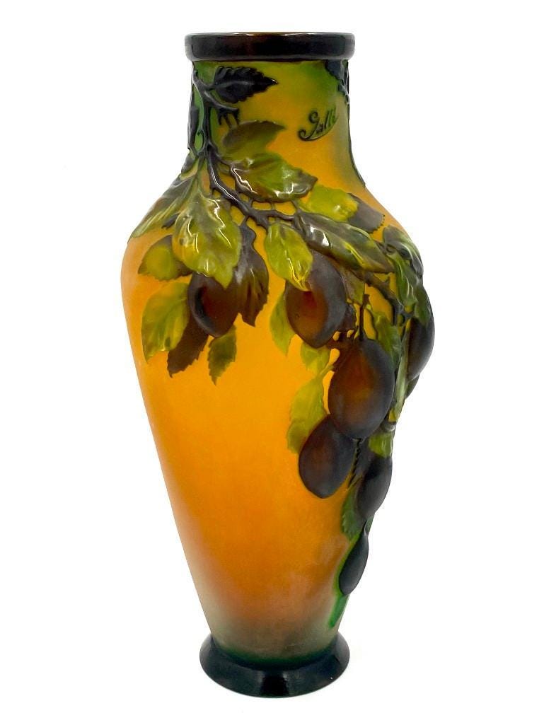 Galle cameo glass blown out vase with a Plums design, 15 ½ inches tall, of baluster form, fire polished with pendant branches heavy with plums ($9,840).
