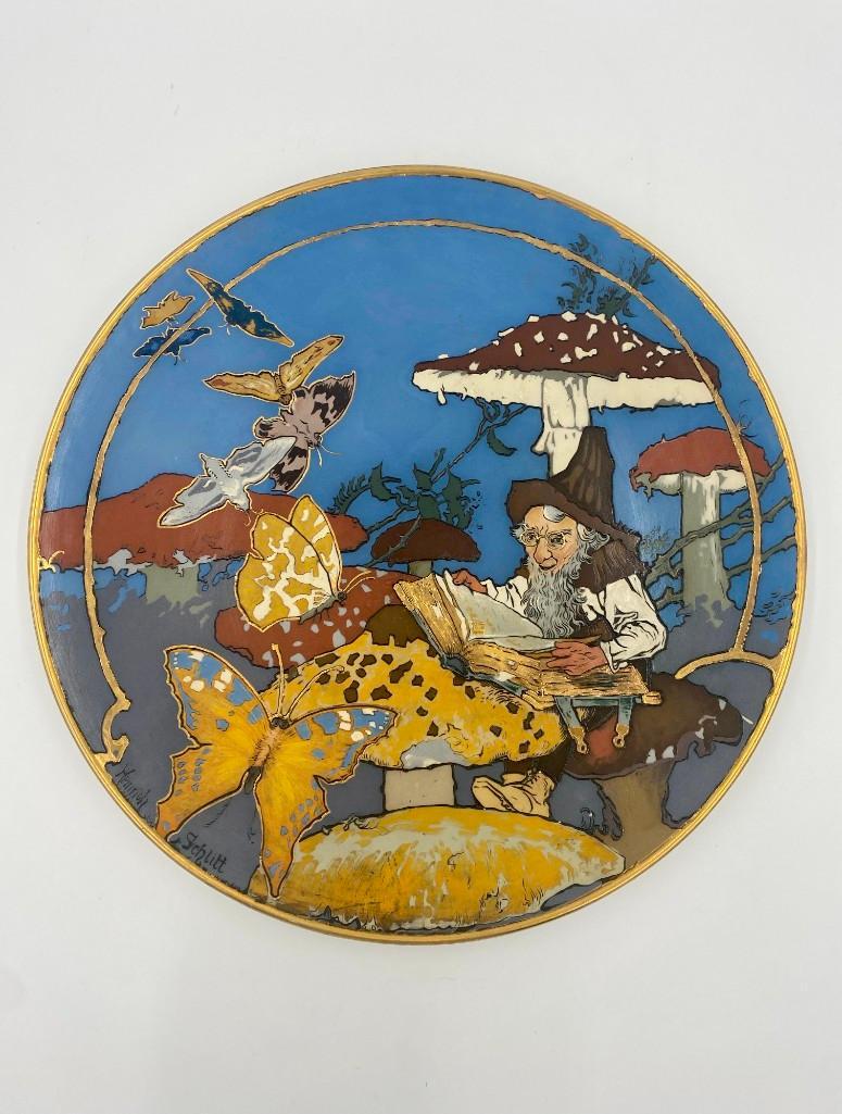 A beautiful Mettlach stoneware charger by Heinrich Schlitt, 17 ½ inches in diameter, the large circular form depicting a scholarly gnome reading a book in a toadstool forest, signed lower left with impressed marks for Mettlach and stamped ‘2698’, earned $3,321. Also, a Royal Worcester Embassy pattern dinner service for twelve with the Royal Worcester mark in black made $3,075.