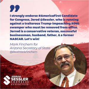 Finchem tweeted, “I strongly endorse #AmericaFirst Candidate for Congress, Jerod @Sessler, who is running against a traitorous Trump-impeaching RINO swamper who must be removed from office. Jerrod is a conservative veteran, successful businessman, husband, father, & a former NASCAR. Let's win!”