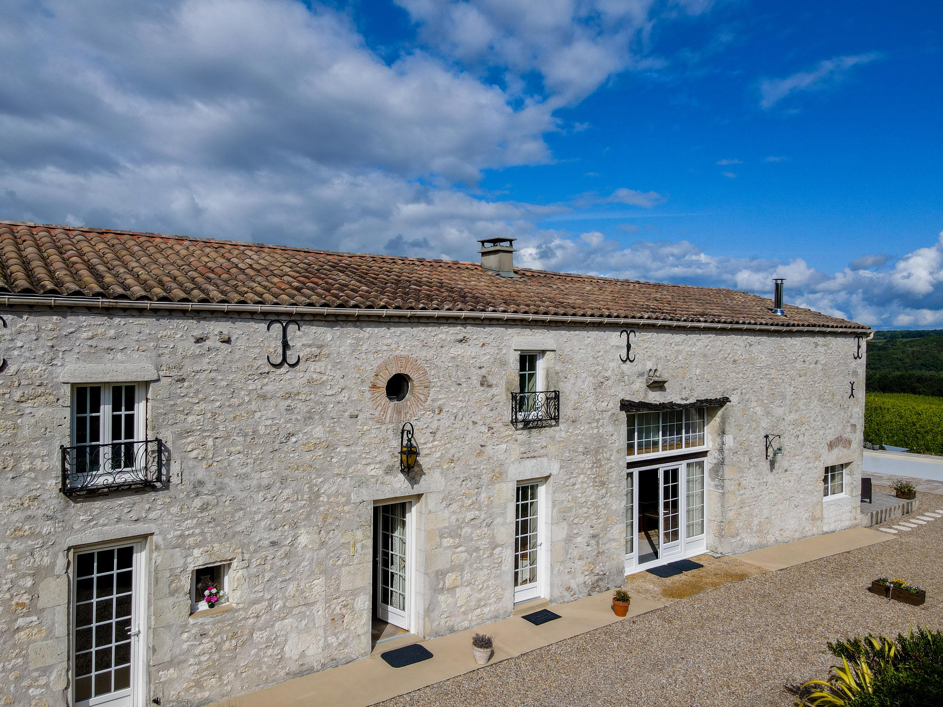Additional features include nine bedrooms; seven bathrooms; wood-burning stoves; skylights; brick fireplaces; designer appliances; butcher-block countertops; heated swimming pool; views of the Bordeaux countryside and vineyards; new electrical, plumbing, and drainage systems; radiant heat.