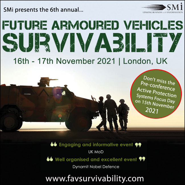 LONDON, UNITED KINGDOM, October 12, 2021 /EINPresswire.com/ -- One month remaining before the Future Armoured Vehicles Survivability, taking place on 16th and 17th November 2021 in London, UK. Attendees will get the chance to hear the latest survivability updates from the current and future armoured vehicles that will drive manoeuvre options for years to come.Building on the success of last year, the 2021 event will gather senior military and industry professionals to discuss the developments driving the protection of armoured vehicle platforms and personnel. As the only armoured vehicles conference dedicated to survivability, this conference will be a key date for all those in the field.