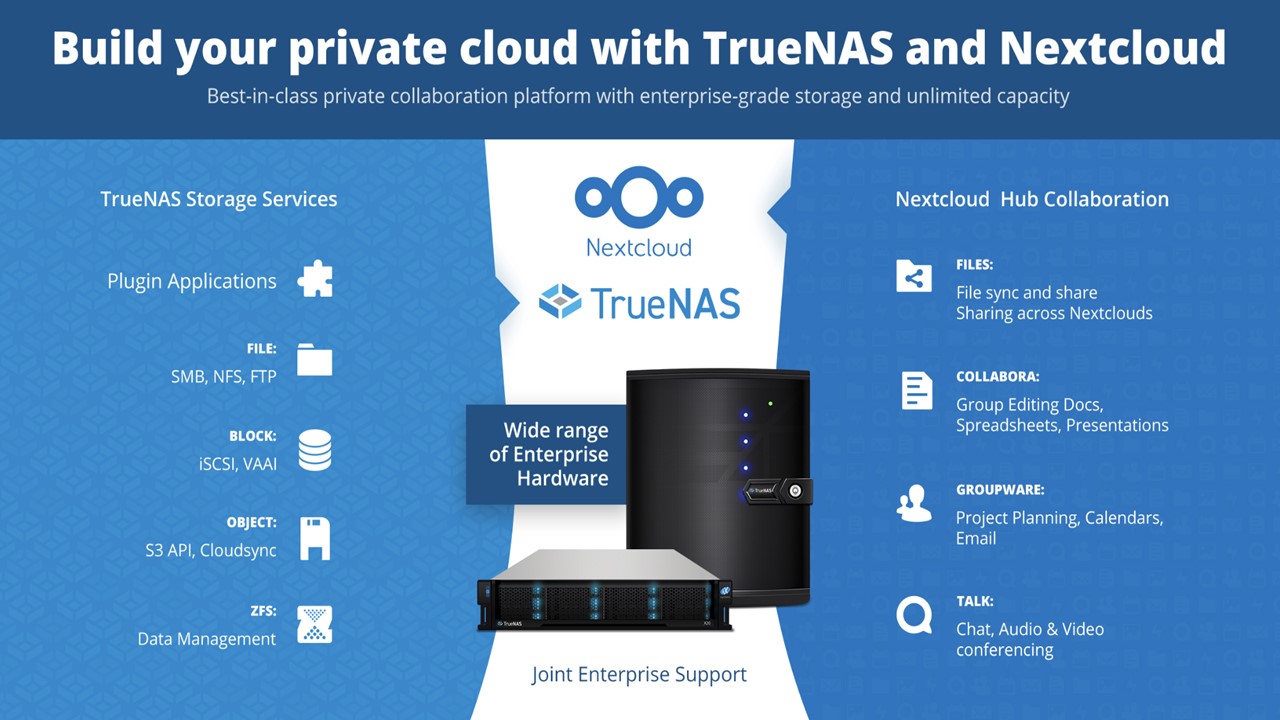 SAN JOSE, CA, UNITED STATES, October 12, 2021 /EINPresswire.com/ -- Nextcloud GmbH, the company behind the worlds' most deployed on-premises content collaboration platform, and iXsystems inc., developers of the industry’s number one Open Storage platform, announce a partnership to bring the full suite of Nextcloud Hub features to TrueNAS. Tens of thousands of TrueNAS systems already run Nextcloud and availability of a supported, well integrated offering will give larger organizations more confidence to deploy.“As self-funded companies that share a strong Open-Source philosophy, Nextcloud and TrueNAS are natural partners,” said Frank Karlitschek, CEO and Founder, Nextcloud. “Our mutual customers will benefit from an open and flexible platform with strong enterprise support capable of delivering efficient collaboration at any scale.”