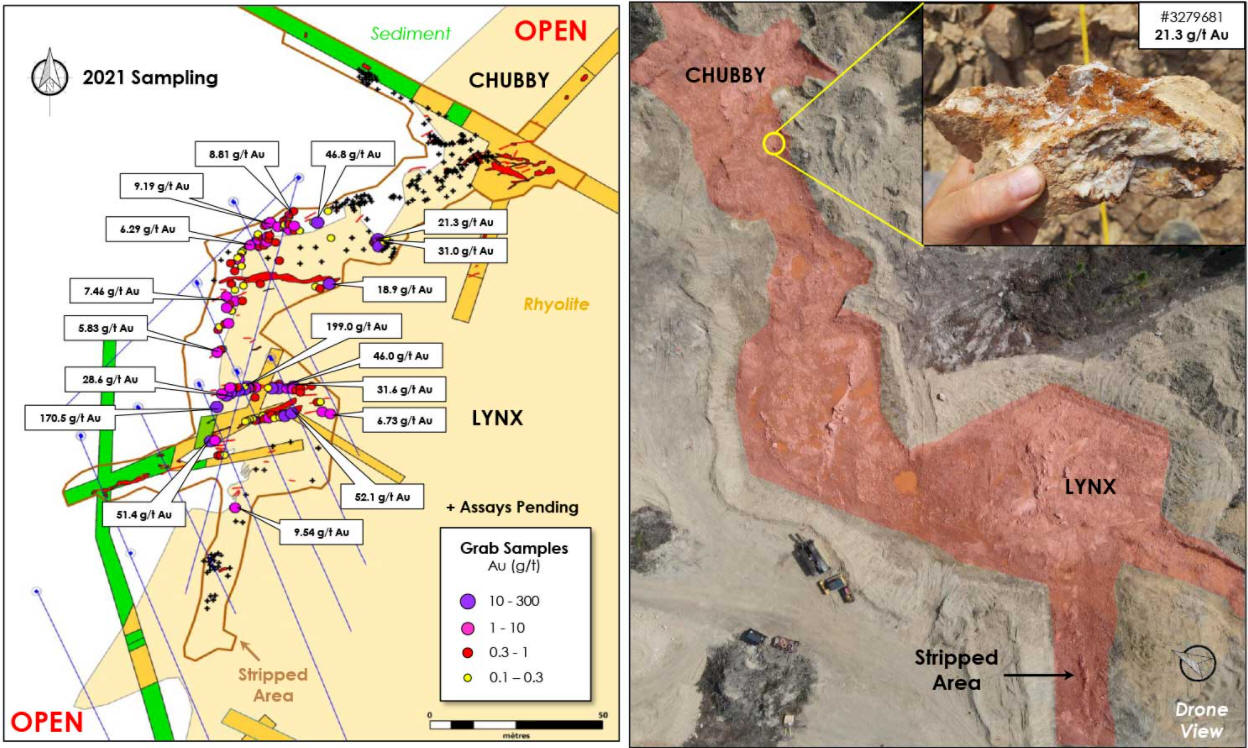 Quinton Hennigh: "These are rock chip samples from Puma, I talked about Puma for the first time just a few weeks ago... and it happened to coincide with a very impressive drill hole; a bit over 50 m, a bit over 5 g/t [ September 15, 2021: Puma Exploration Drills 5.55 g/t Au over 50.15 meters* on Initial Drilling at Williams Brook Gold Property ] in a new discovery in New Brunswick, this is basically a virgin goldfield that is just in the process of discovery. What struck me when I first looked at Puma was the exceptionally high-grades that they were finding in rock chip samples as well as seeing locally in the drill core. Here is another suite of samples that were collected in this Lynx/Chubby area which again .... look at the grades here; we are seeing many many samples in the multi-ounce range, ounce +, and tens of grams, these are fantastic numbers. But what really gets me stoked is where these samples are coming from. So let's go to the next slide..."